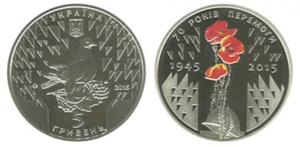 Національний банк ввів в обіг пам’ятні монети “70 років Перемоги. 1945 – 2015” номіналом 5 гривень накладом 35 тисяч штук і номіналом 1 гривня накладом 7 мільйонів штук, повідомляє прес-служба НБУ.