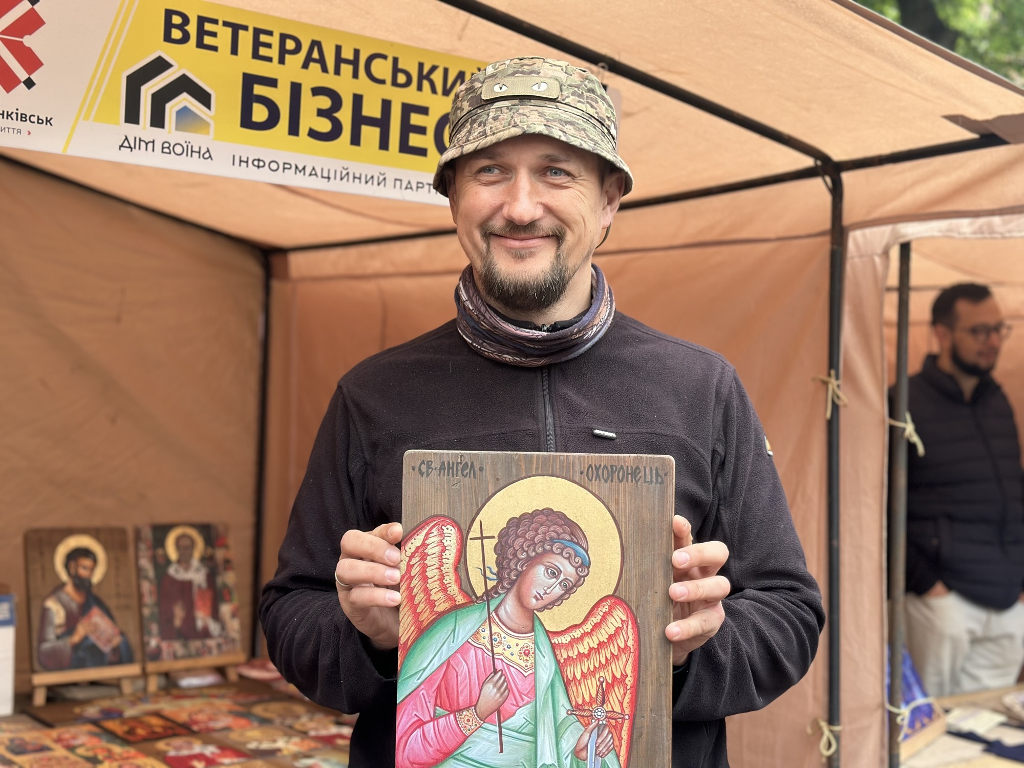 Історією свого ремесла поділився і львів’янин, ветеран Андрій Бень, який разом із дружиною виготовляє ікони на дереві. Ідея виникла після Революції Гідності: спершу вони створили 200 ікон для передової, а згодом це перетворилося на справу життя. Частину ікон подружжя розписує вручну, інші — створює за допомогою експрес-технології.