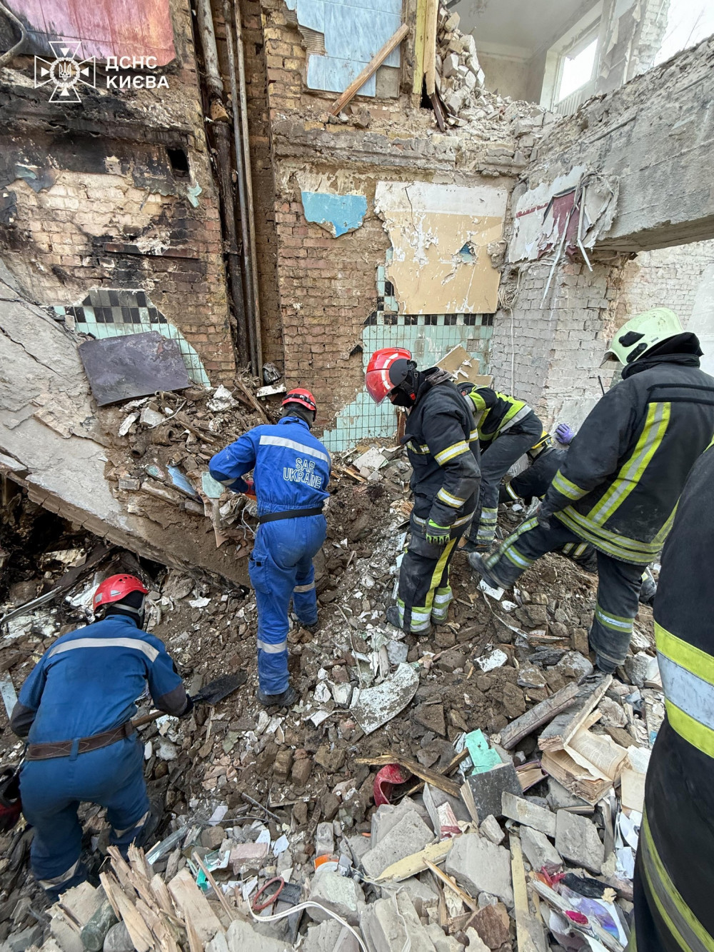 “У Солом’янському районі всю ніч безперервно тривали пошукові роботи. Станом на 07.00 з-під завалів частково зруйнованого дев’ятиповерхового будинку деблоковано тіла ще 5 загиблих осіб. Всього за вказаною адресою вилучено тіла 16 осіб. Роботи тривають. Всього у столиці загинула 21 особа та 134 людини постраждало”,- кажуть у ДСНС.