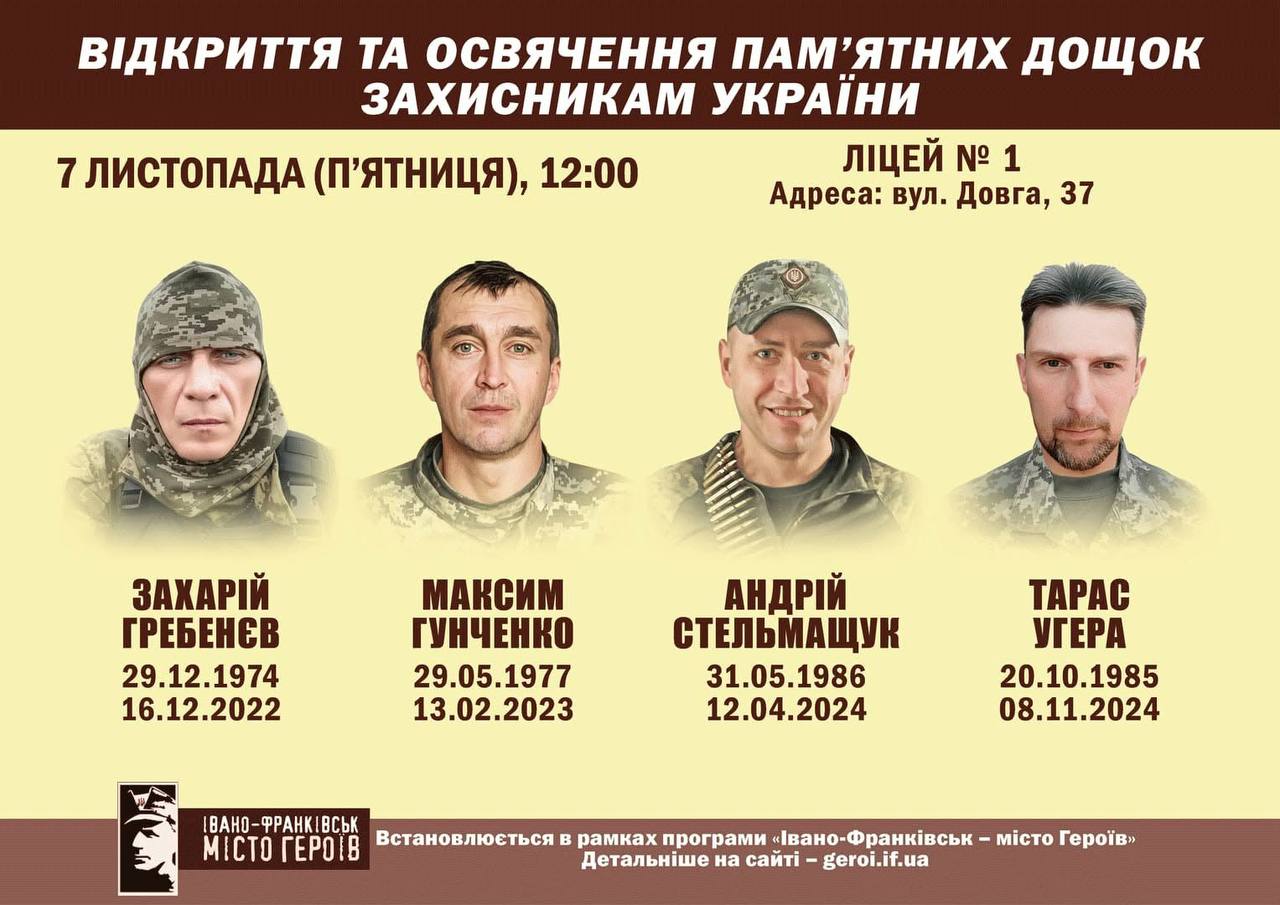 У п’ятницю, 7 листопада, в Івано-Франківську відкриють чотири анотаційні дошки на честь полеглих Захисників — Захарія Гребенєва, Максима Гунченка, Андрія Стельмащука та Тараса Угери.