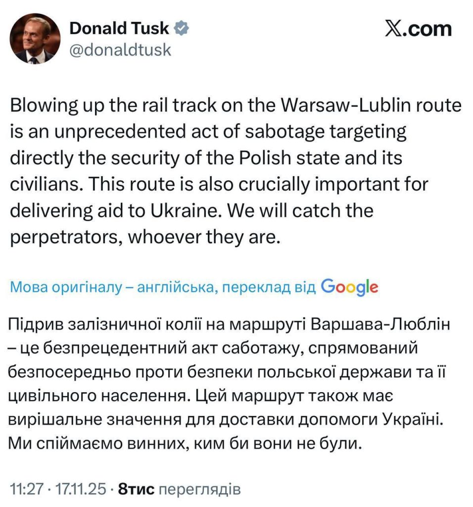 Прем’єр-міністр Польщі Дональд Туск у своєму повідомленні у соцмережах зазначив: «Цей маршрут також надзвичайно важливий для доставки допомоги в Україну. Ми знайдемо винних, ким би вони не були».