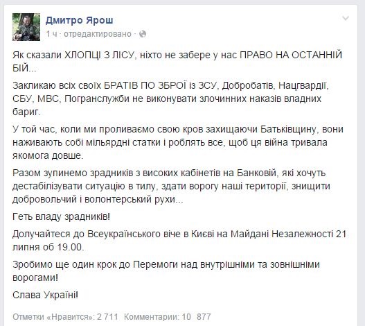 Лідер Правого сектора Дмитро Ярош закликав службовців ЗСУ, Нацгвардії, СБУ, МВС та Прикордонної служби не виконувати накази влади. Про це він написав у своєму Facebook.