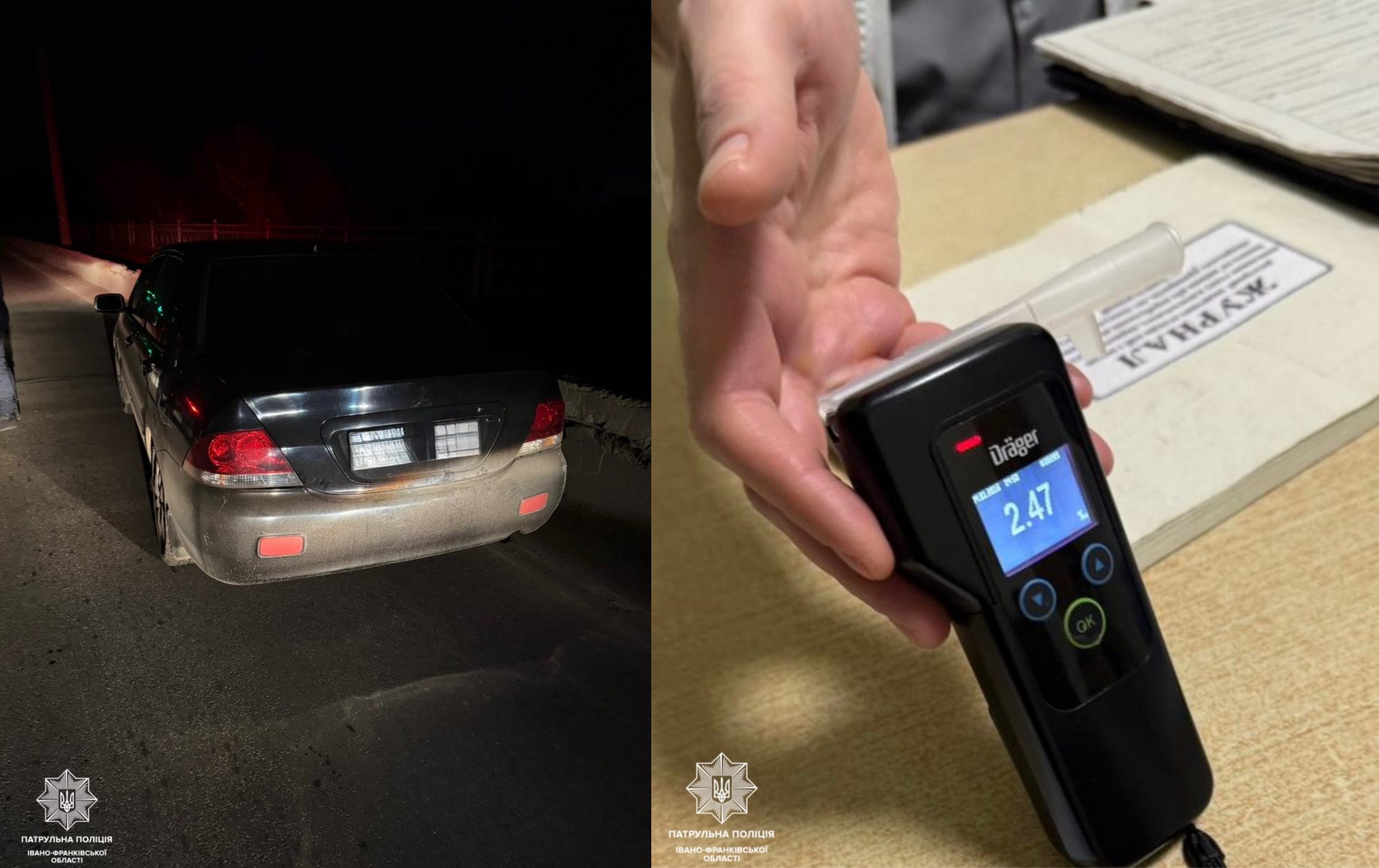 Під час спілкування у 35-річного кермувальника помітили явні ознаки сп’яніння. Алкотестер показав 2,47 проміле алкоголю. Також з’ясувалося, що у водія немає страхового поліса.
