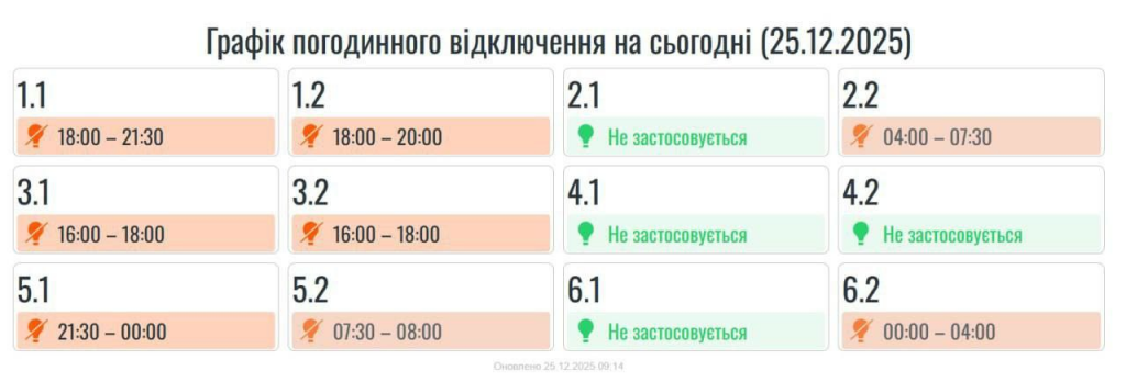 Як повідомила пресслужба “Прикарпаттяобленерго”, 25 грудня, ГПВ будуть діяти протягом доби.