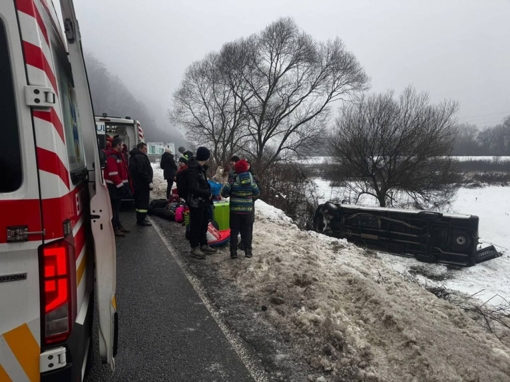 О 8:36 надійшло повідомлення, що через ожеледь мікроавтобус Mercedes Sprinter раптово з’їхав з траси між Перечином та Зарічово й перекинувся на бік.