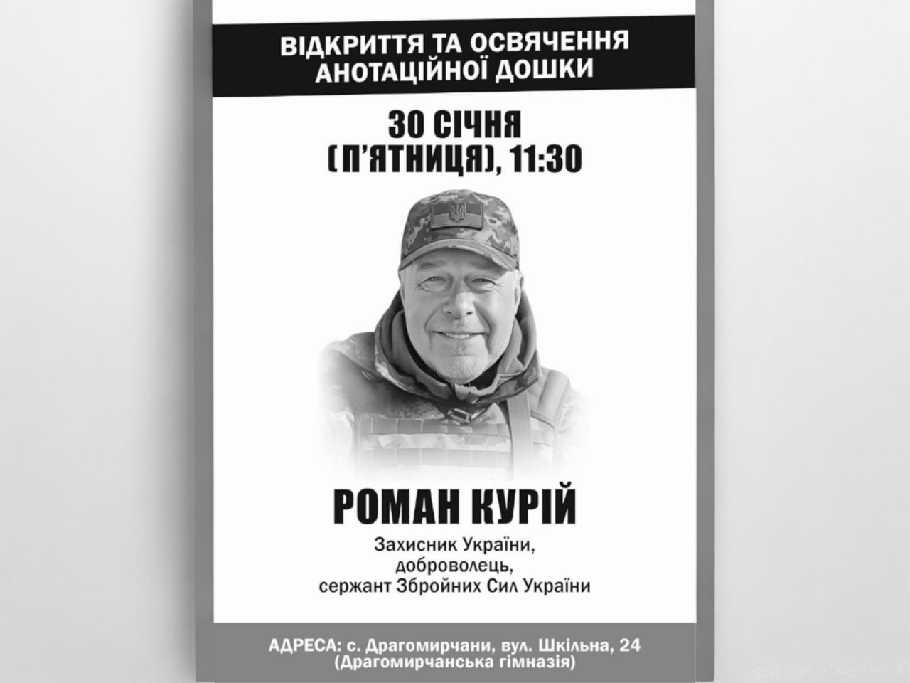 У п’ятницю, 30 січня, у селі Драгомирчани на Івано-Франківщині відкриють анотаційну дошку полеглому захиснику України Роману Курію. Про це повідомив Руслан Марцінків.