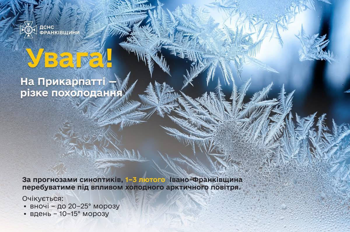 На початку лютого Івано-Франківщина опиниться під впливом холодного арктичного повітря. У період з 1 по 3 лютого синоптики прогнозують суттєве зниження температури та посилення морозів.