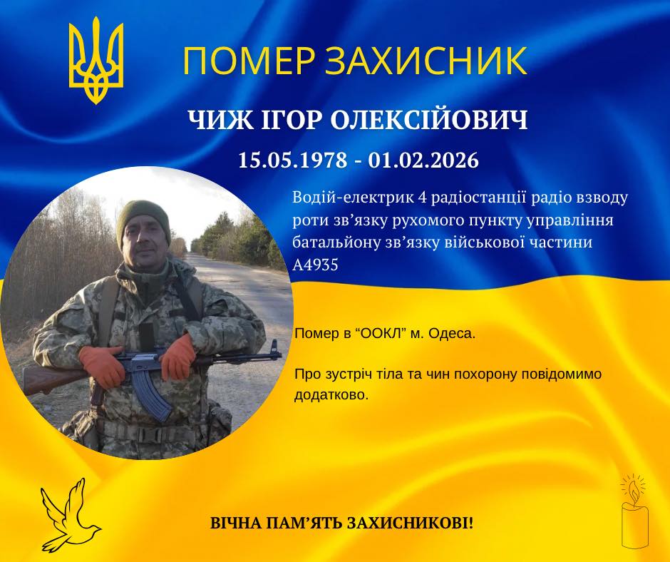 1 лютого у Одеській обласній клінічній лікарні помер 47-річний захисник з Долинської громади, села Мала Турʼя  Ігор Чиж.