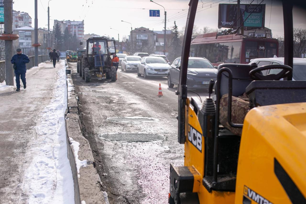 В Івано-Франківську тривають ремонтні роботи на мосту в напрямку мікрорайону Пасічна. Комунальники ліквідовують найглибші аварійні вибоїни, використовуючи холодний асфальт, про це інформує Руслан Марцінків.
