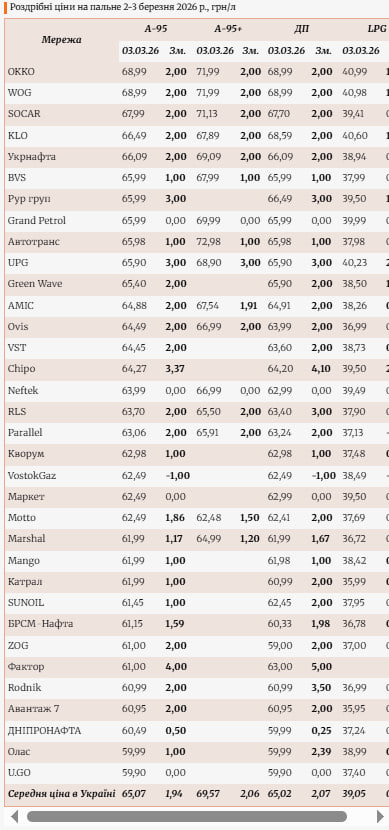 В Україні за добу, з 2 по 3 березня, ціни на пальне в середньому зросли на близько 2 грн/л. Середня ціна на А-95 піднялася до 65,07 грн/л, А-95+ — до 69,57 грн/л, дизельне пальне — до 65,02 грн/л, а скраплений газ — до 39,05 грн/л. Проуе пише Судово-юридична газета з посиланням на Enkorr.