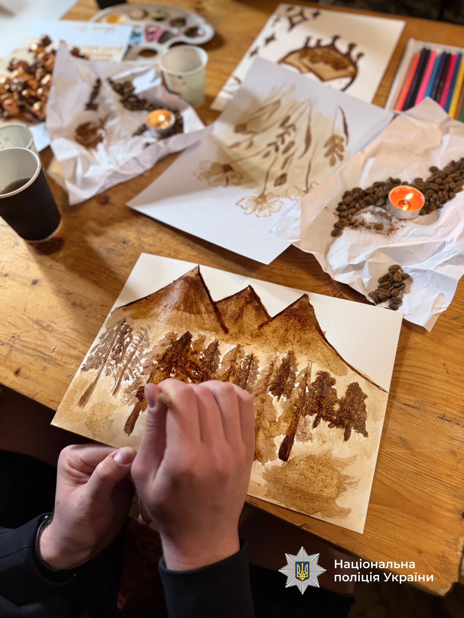Це особлива техніка малювання розчином натуральної кави, яка допомагає не лише творити, а й проживати складні емоції. Під час заняття психологи відомчих структур МВС — Національної поліції, ДСНС та Нацгвардії — працюють із бійцями, допомагають їм знизити рівень стресу, стабілізувати емоційний стан і знайти внутрішні ресурси через творчість, повідомляють у пресслужбі поліції області.