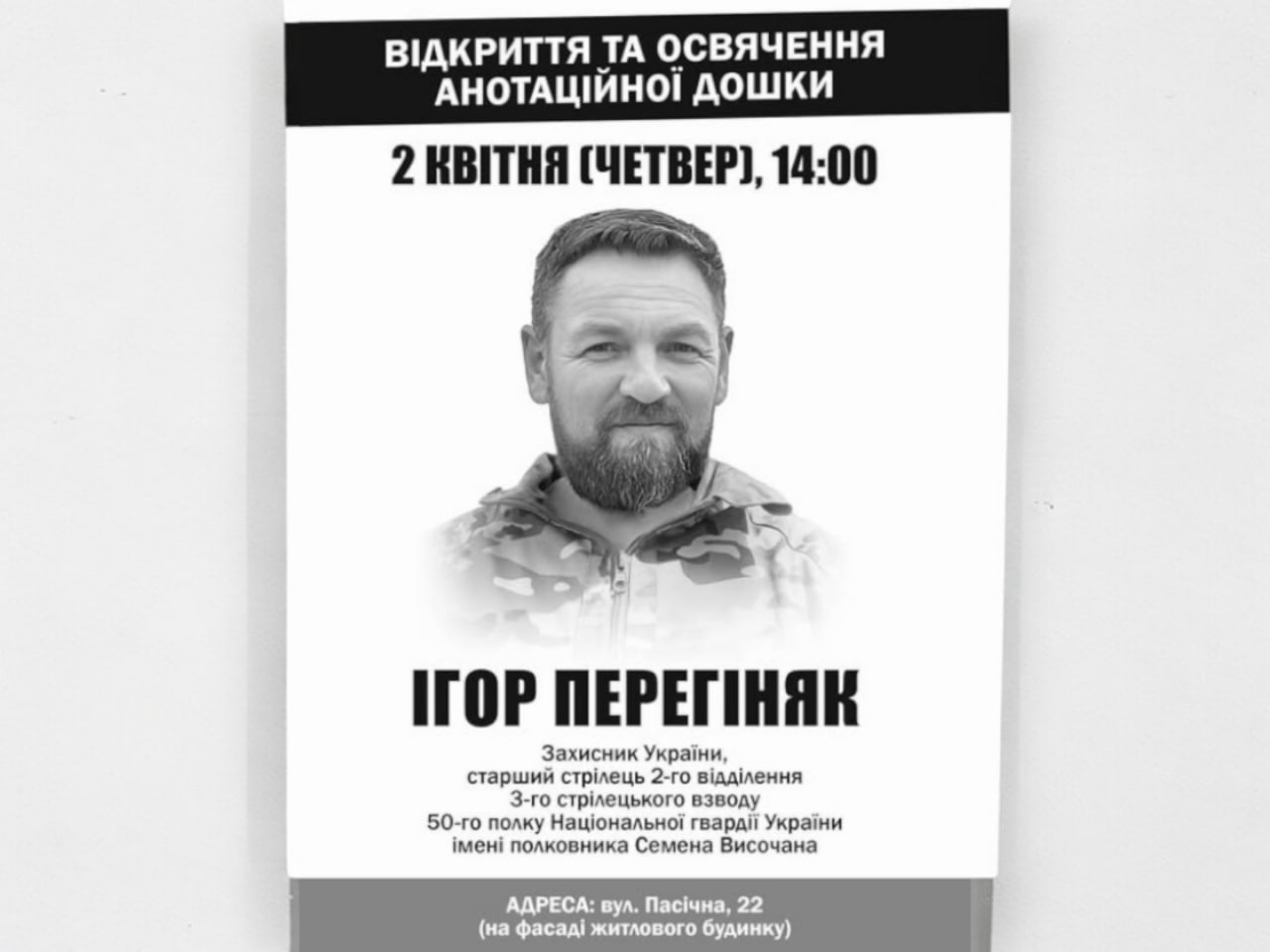 У четвер, 2 квітня, на фасаді житлового будинку за адресою вул. Пасічна, 22, встановлять пам’ятну дошку Захиснику України Ігорю Перегіняку. Про це повідомив Руслан Марцінків.