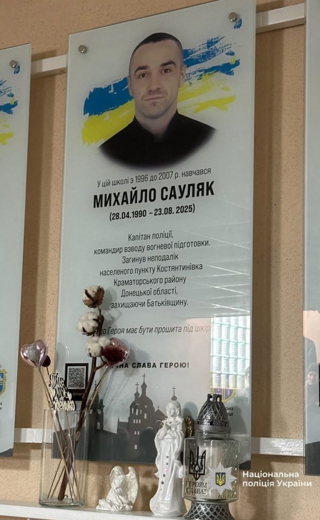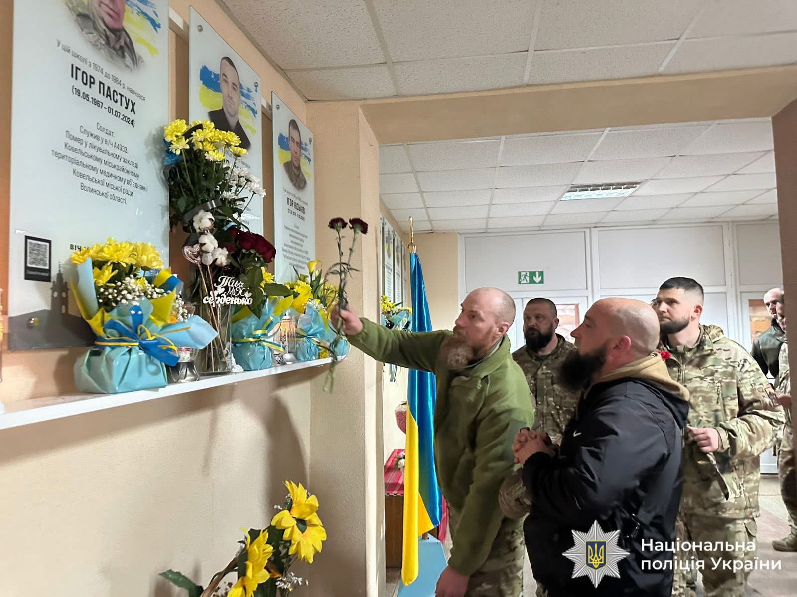 На відкриття меморіальної дошки прийшли рідні загиблого, колеги, бойові побратими, учні та педагоги. Присутні вшанували пам’ять поліцейського хвилиною мовчання та поклали квіти.
