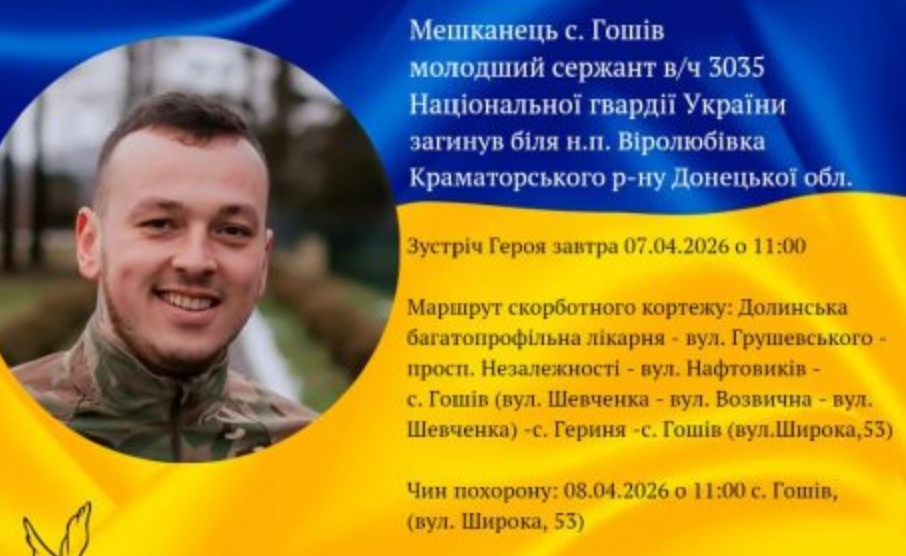 Чин похорону відбудеться 8 квітня о 11:00 у с. Гошів (вул. Широка, 53).