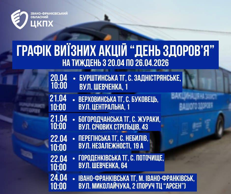 В Івано-Франківській області тривають виїзні акції «День здоров’я». Упродовж 20–26 квітня мобільні медичні бригади працюватимуть у різних громадах, надаючи безкоштовні консультації, обстеження та психологічну допомогу.