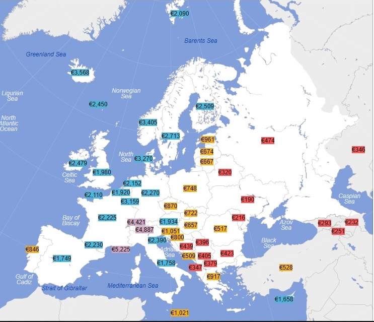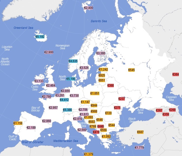 * Ще вищі зарплати, ніж у Швейцарії – у включених на карті нижче, але не включених у таблицю малесеньких Ліхтенштейні та Монако.