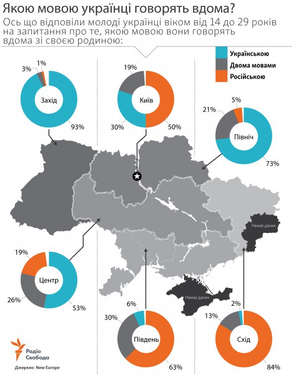 У південних та східних областях більшість спілкується російською. Це 63% та 84% відповідно.
